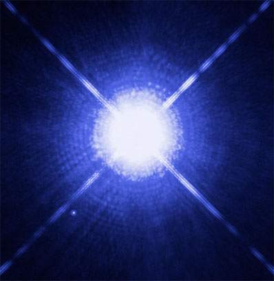 Этот снимок Сириуса, самой яркой звезды нашего ночного неба, был сделан космическим телескопом Hubble в октябре 2003 г. Хорошо известно, что Сириус это двойная звезда, которая представляет собой систему из двух звезд - яркой голубой звезды Sirius A и белого карлика Sirius B, который по яркости в 10 тысяч раз уступает Sirius A. Эти две звезды находятся на расстоянии 8,6 световых лет от Земли. Они вращаются вокруг общего центра тяжести с периодом 50 лет.